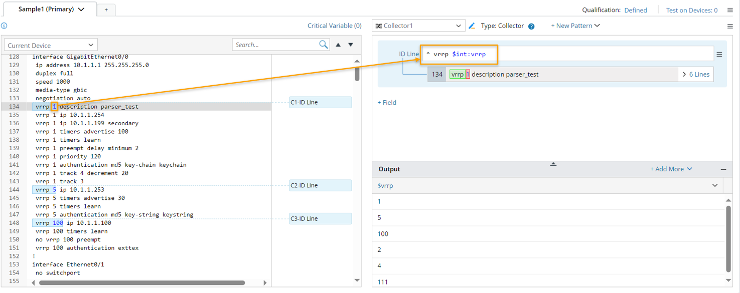 - Double-click 1 in line 134 to parse the variable $int: vrrp, then an ID Line is created, which will be used as the keyword to identify recurring groups. If you want to define an optional Parent Line, please refer to Parent Line for more details.