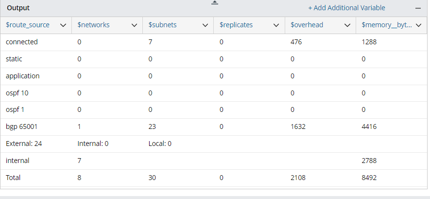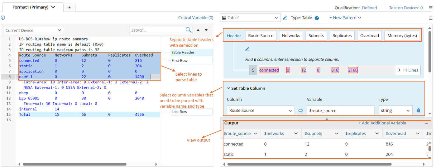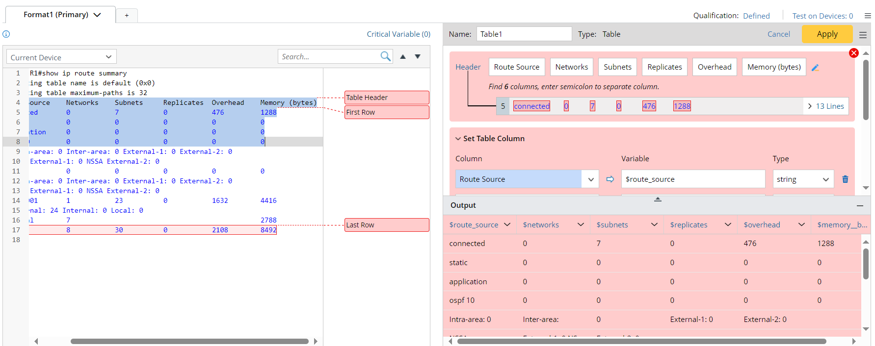 Take the parsing of the IP Route Summary table as an example. You can define a Table Parser to parse the IP Route basic information.