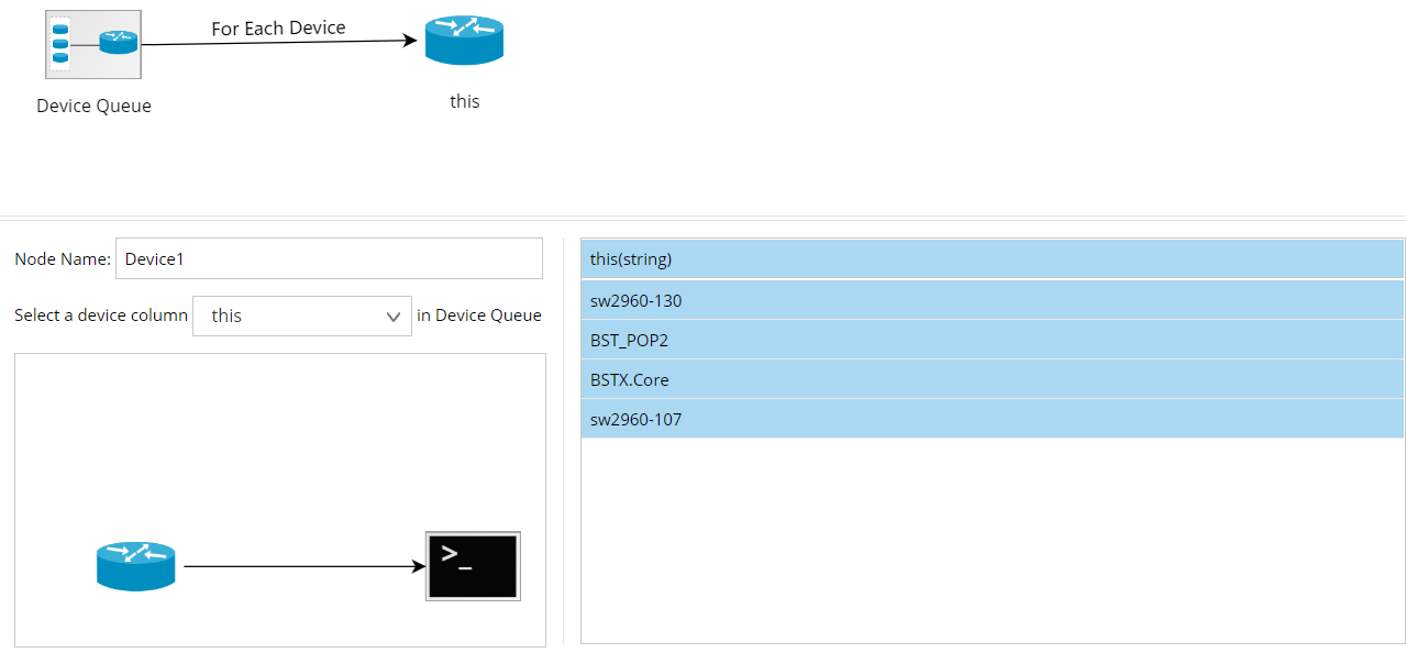 - At the Device Queue node, select Device in the Device From list. The Device Queue builds devices in a single-device pattern and each device is a single independent row.