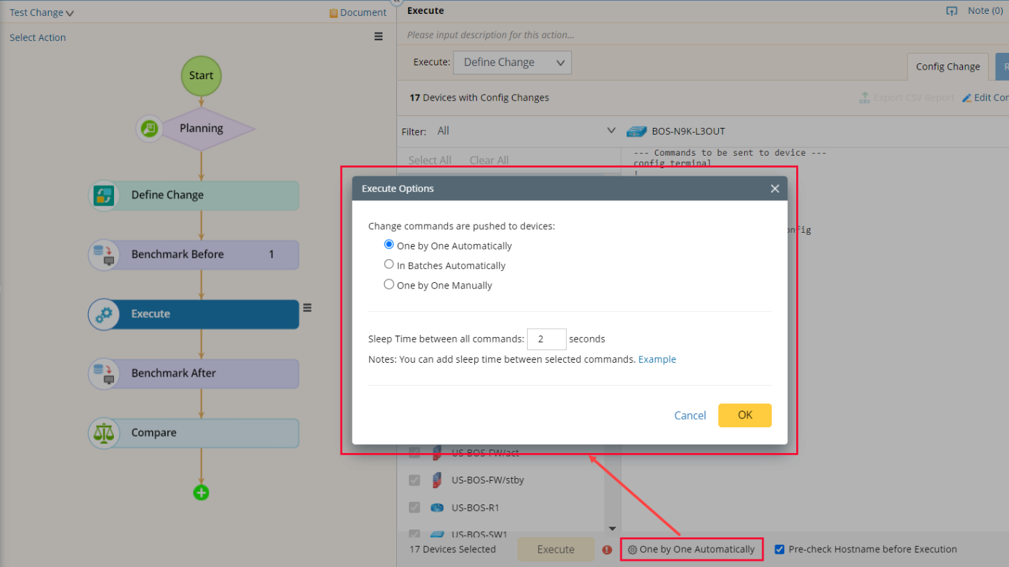 - One by One Manually — push change commands to a device manually, and you need to click Execute to push commands to the next device manually.