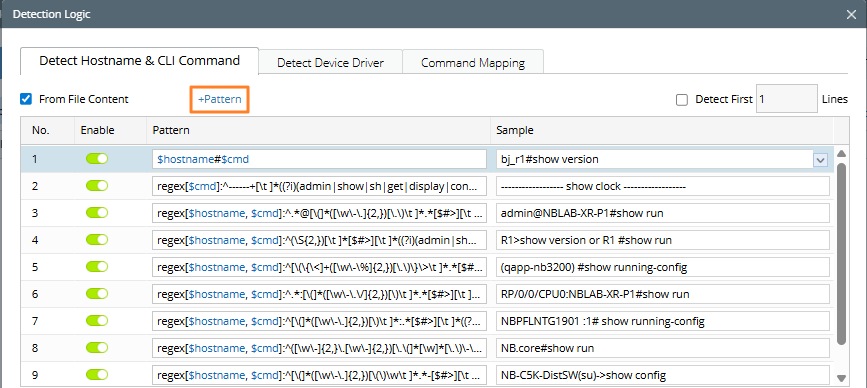 For a set of files, multiple patterns can be defined by clicking + Pattern. NetBrain has defined a set of default Patterns, you can modify them and add more if needed.