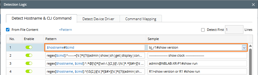 Example: If the file contains texts like r1#show version, you can define the pattern $hostname#$cmd to parse such content.