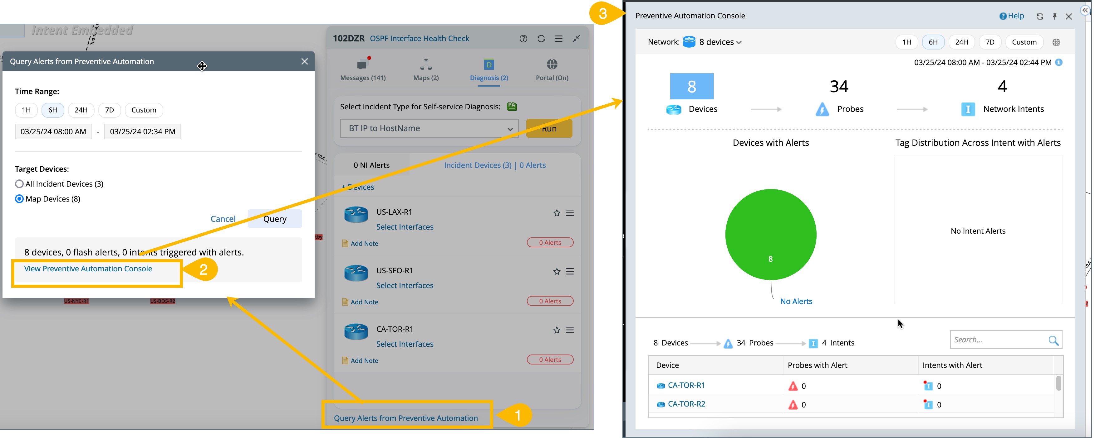 You can query all alerts for incident devices or current map devices. A query summary is displayed in the Query Alerts from Preventive Automation window from Incident Message pane. And the query summary has a link to View Preventive Automation Console.