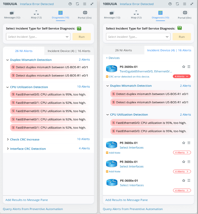 After the NI/NIC in Diagnosis is executed, the execution results will be manually sent to the incident message tab (click Add Results to Message Pane) and the output of the diagnosis pane.