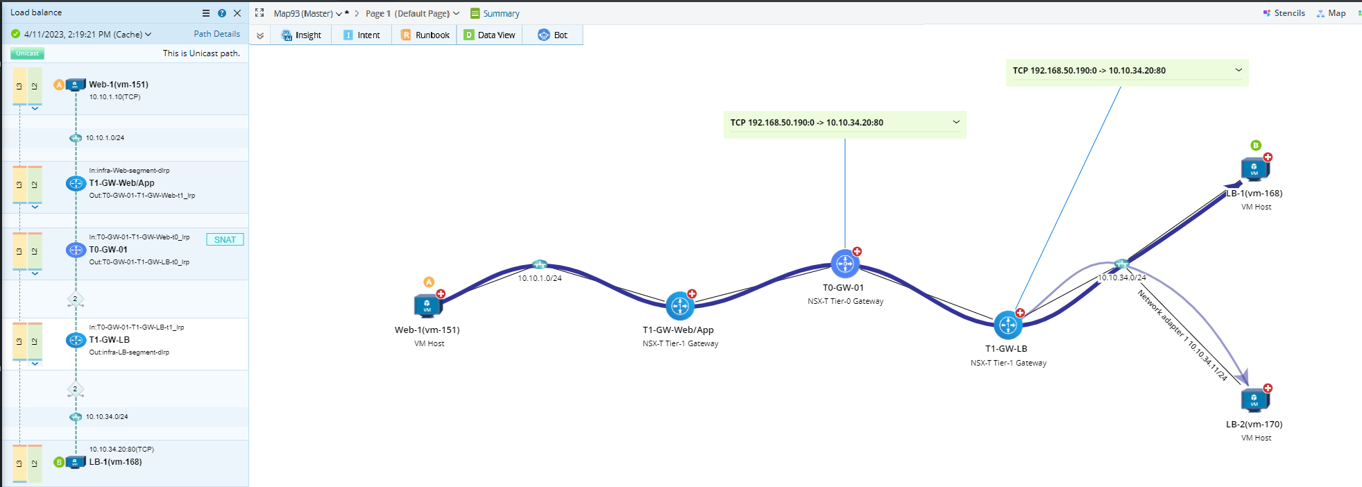 - Path feature can calculate the A/B path between the two endpoints inside or outside the NSX-T networks. The path calculation can also support checking DFW Policy, Gateway Policy, NAT and Load Balancer, which can help analyze the security, traffic flow, or load balancing quickly and visually.