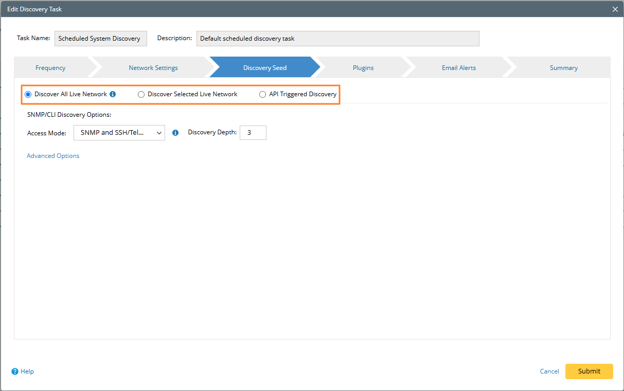 On the Discovery Seed tab, select the discovery seed for the scheduled discovery. There are three types of discovery seeds to be selected:
