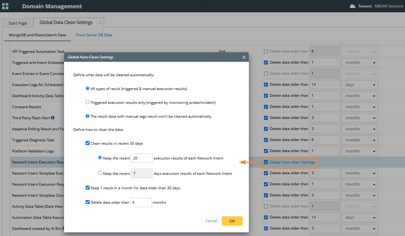To avoid performance problems caused by more and more intent execution data, auto-clean the intent execution request in the Domain Management page > Global Data Clean Settings. This logic is enabled by default, and the default time is 1 month.