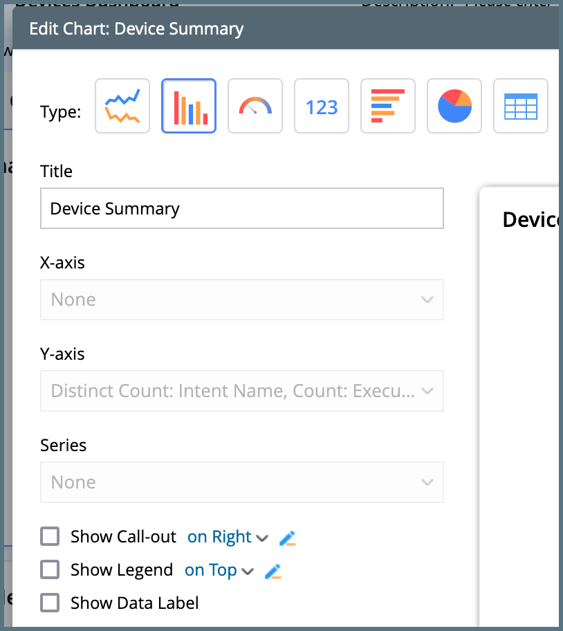 In Edit Chart dialogue, users can modify the chart settings such as chart type, chart title, call-out, etc. It also displays the chart data settings such as the x-axis, y-axis, etc. The table below illustrates the data displayed and defined in Edit Chart Dialogue. The chart setting is like the standard Dashboard