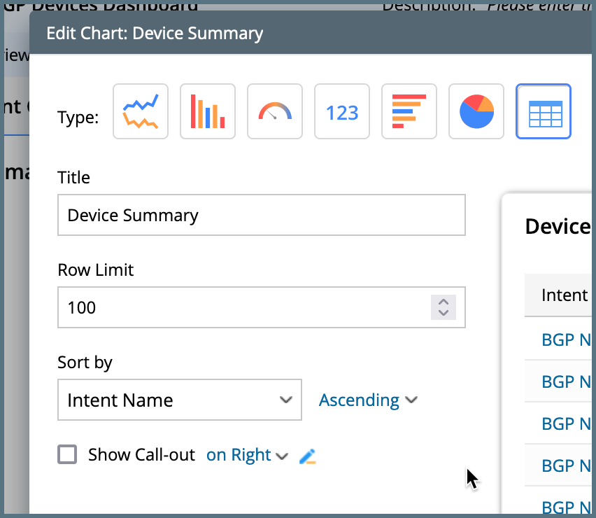 To modify the display settings of the selected chart, click Edit Chart located in the right-side pane. In the Edit Chart interface, you can modify the chart type, title, call-out, and other settings. After adjusting the settings, click OK to save and close the window.