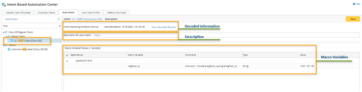 - Macro Variables: You can view macro variables definition for the selected intent. To change the macro variables, click the intent name link after Intent (e.g., conf – ACL - extended) to open the variable definition UI to make changes.