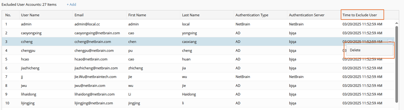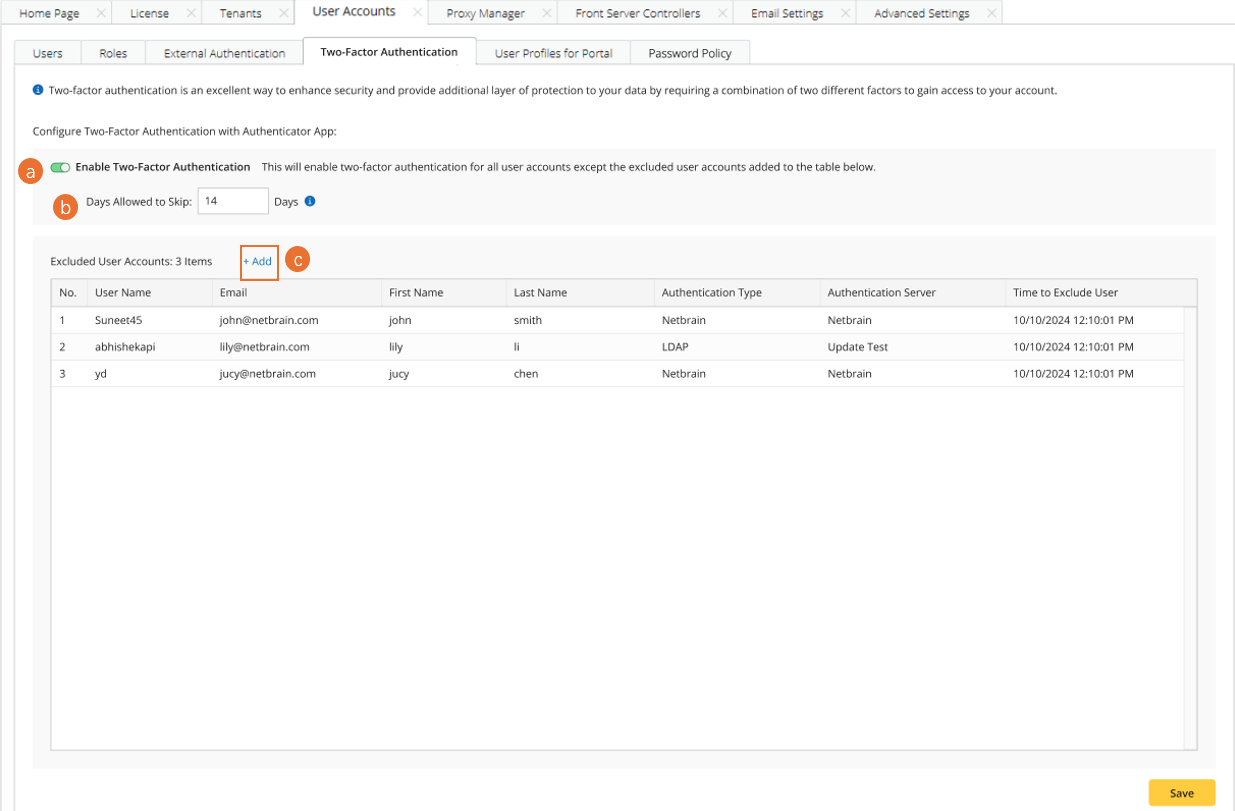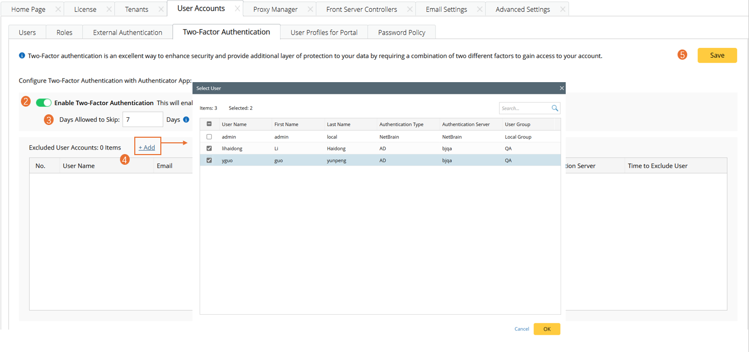 c. Add excluded user accounts: Select users accounts that do not need to complete two-factor authentication for login. For instance, System Admin account can be set as excluded user account so that System Admin can log in to NetBrain in case of emergency.