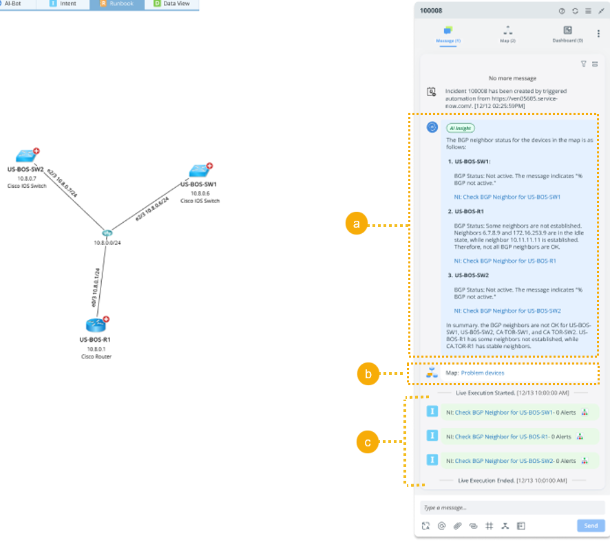 - View results in NetBrain Incident’s message pane.