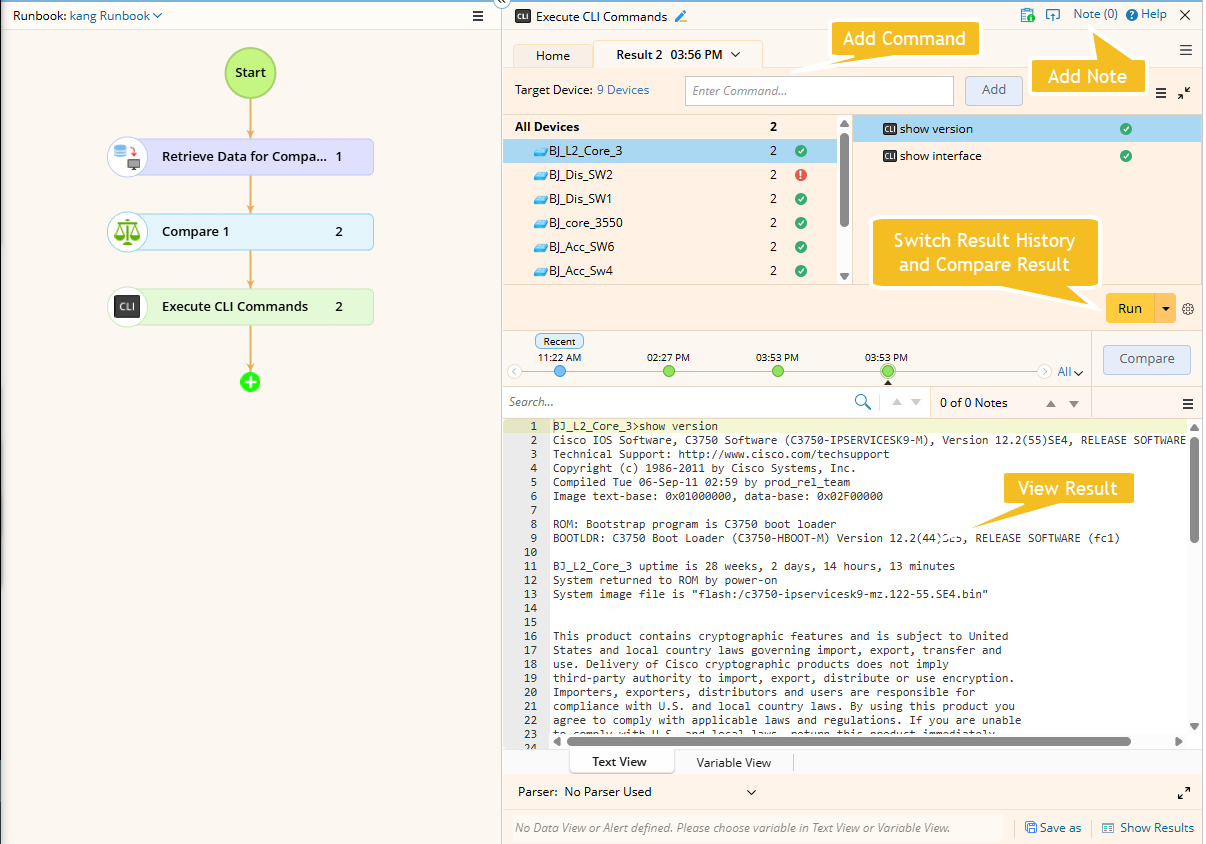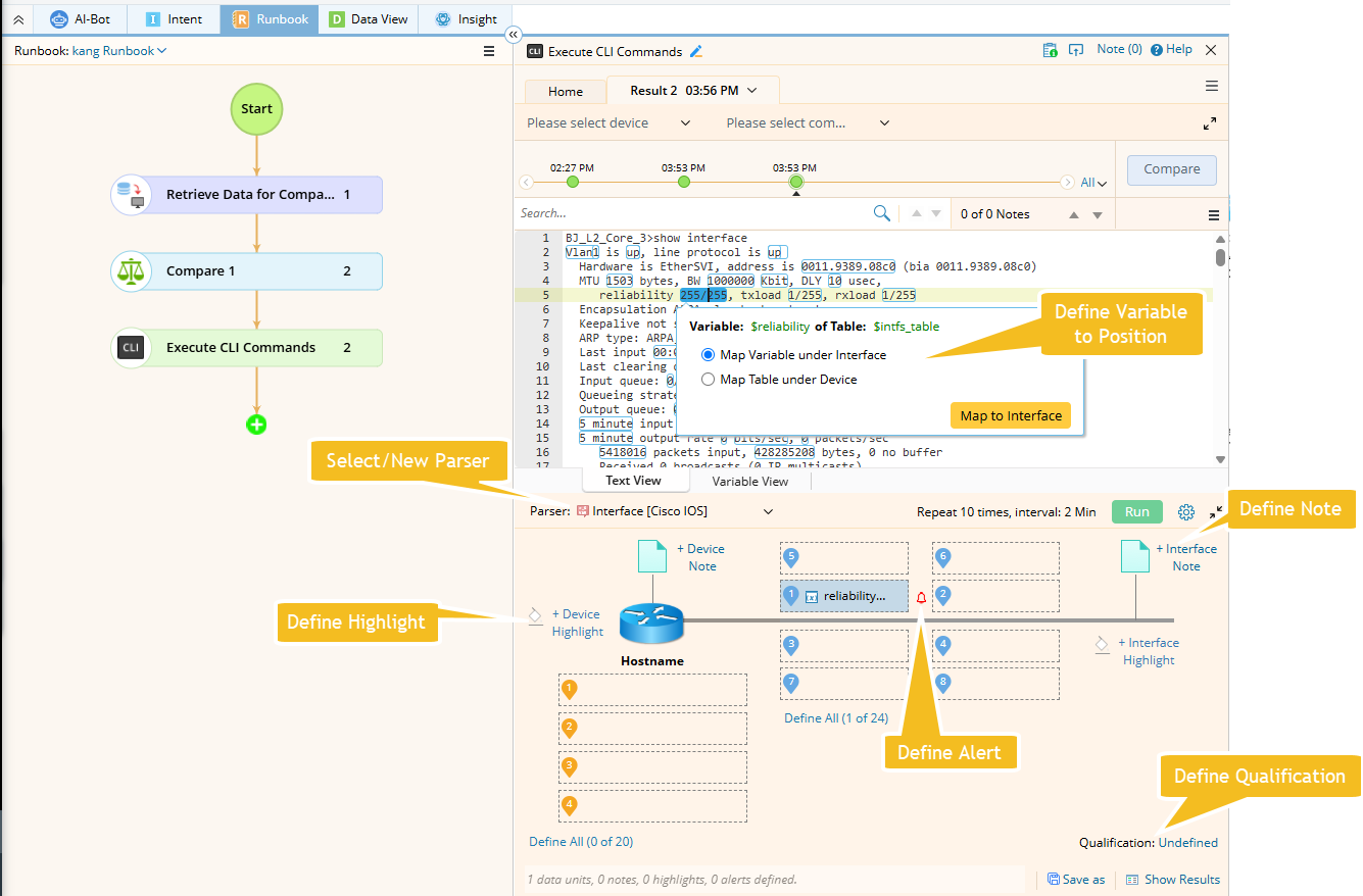 In addition, you can use a parser to parse key metrics from the outputs, monitor them on a map, and see the displayed alert if the target parser variable deviates from the Golden Baseline. You can also compare CLI command outputs from different times to view their differences.