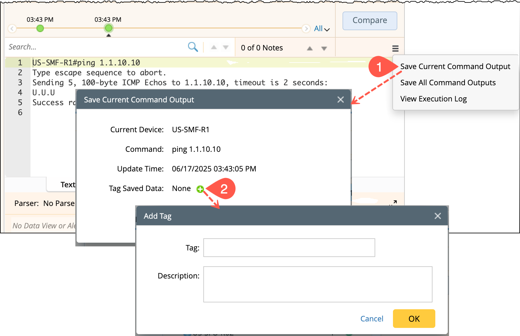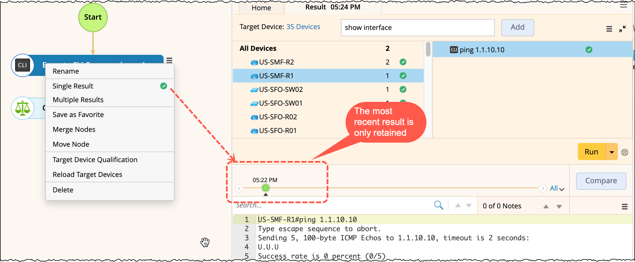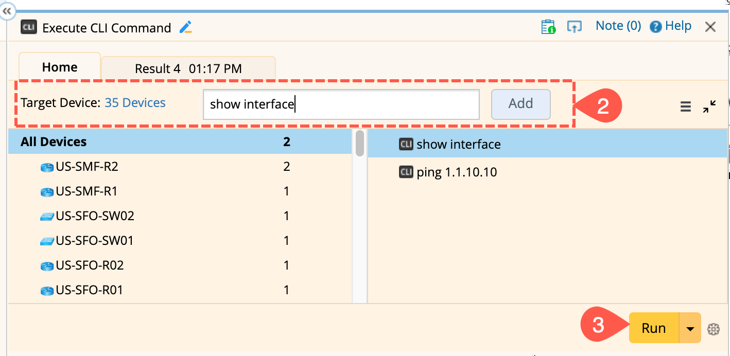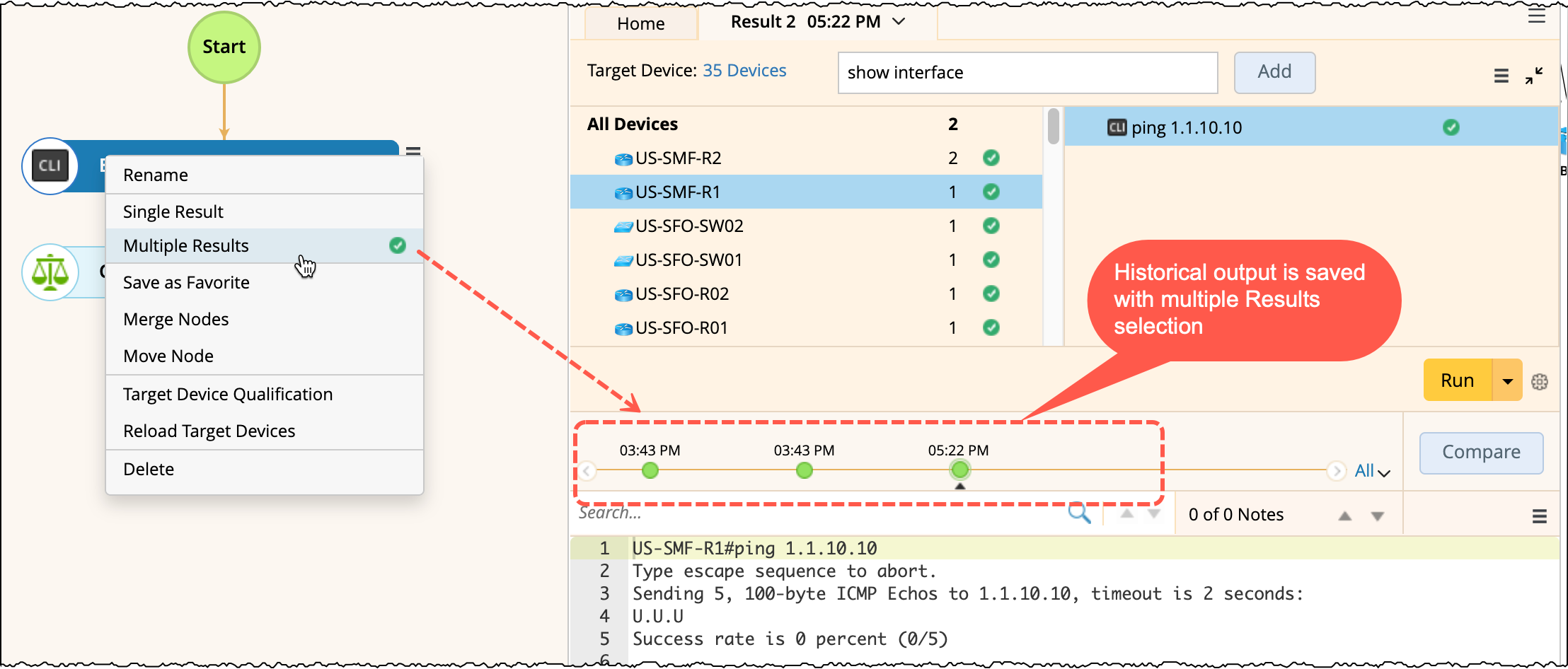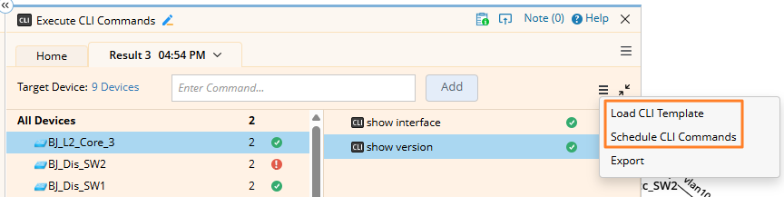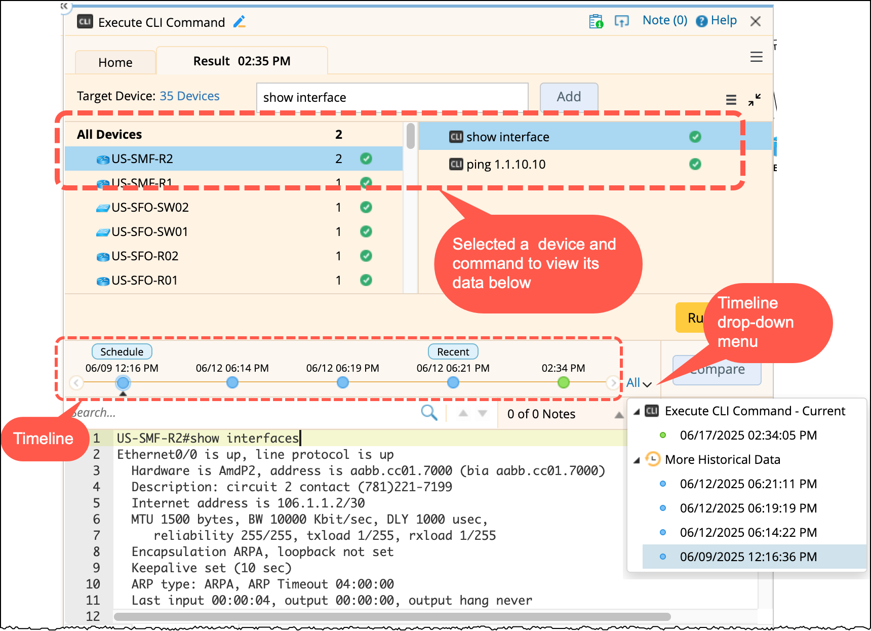 After execution, select a device and a CLI command to view its output. To view or compare historical data: