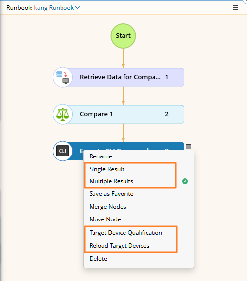Tip: If a runbook is already open, the Execute CLI Commands node will be added to the current Runbook. Otherwise, it will be added to the personal Runbook. -