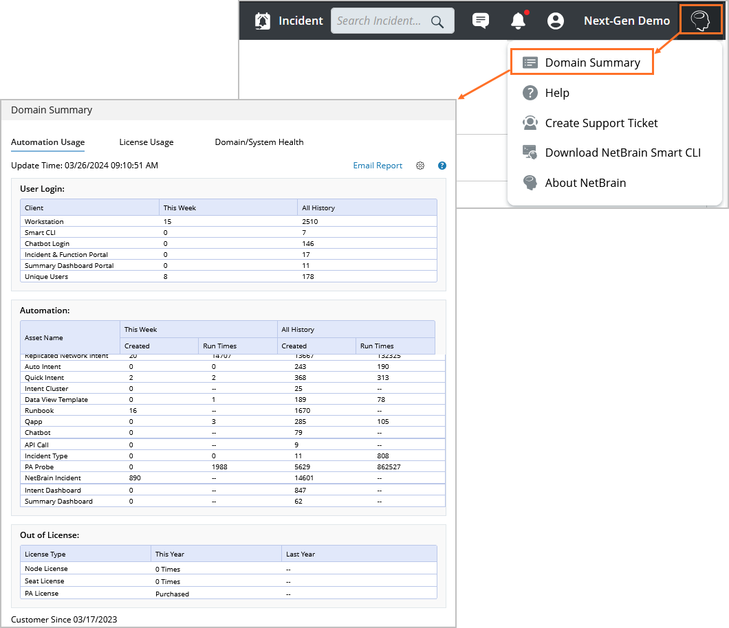 - Automation Usage: The Automation Usage tab displays the statistics of license and user login, and automation creation and execution.