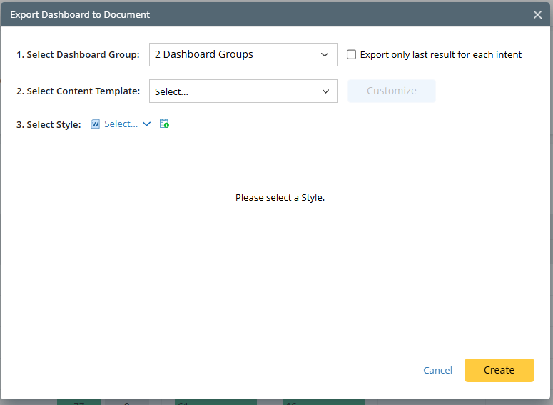 and select Export Dashboard to Document from the drop-down menu.