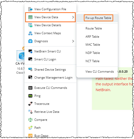 - On a map, right-click the target device CA-YVR-R2, and select View Device Data > Fix-up Route Table.