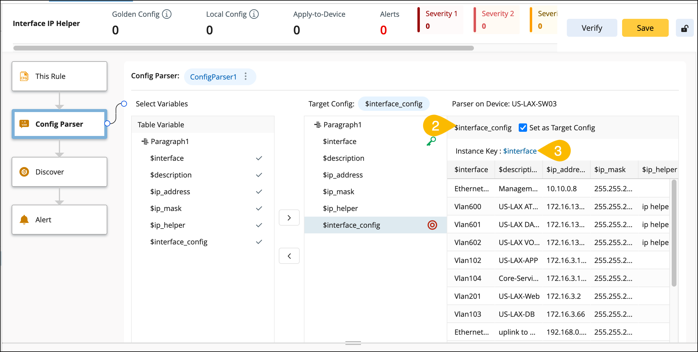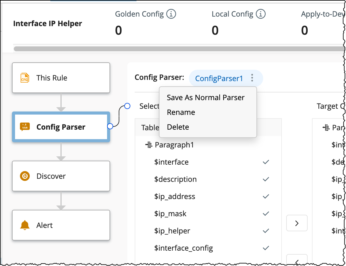 - Select one of the variables as Target Config for subsequent Golden Config definition, calculation, and verification. This Variable can either be a single-value variable for device-level config or a table column variable for instance-level config.
