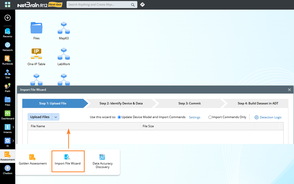 For network consultants who have no/limited live access to the network, Import File Wizard can enable them to use NetBrain's intent-based automation functions to do network assessment for their customer. For example, they can import a set of device command data files to build dataset and then do network assessment based on the dataset.