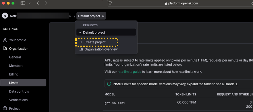 - Create a new project in the OpenAI account.
