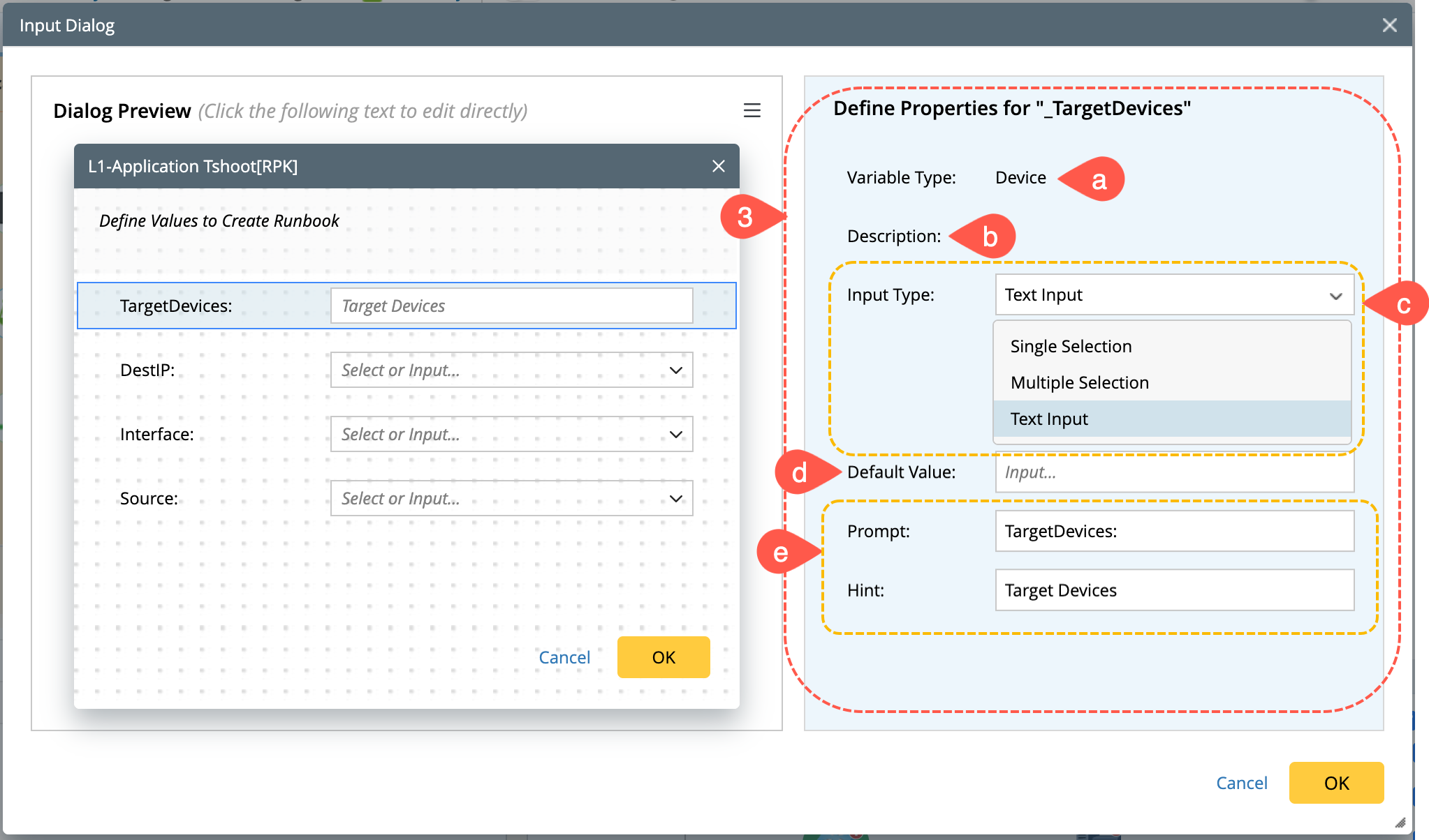 You can use a dedicated Input Dialog to specify which template variables can be used as input variables, as well as the style and functionality of the input UI displayed when creating a runbook from the RBT.