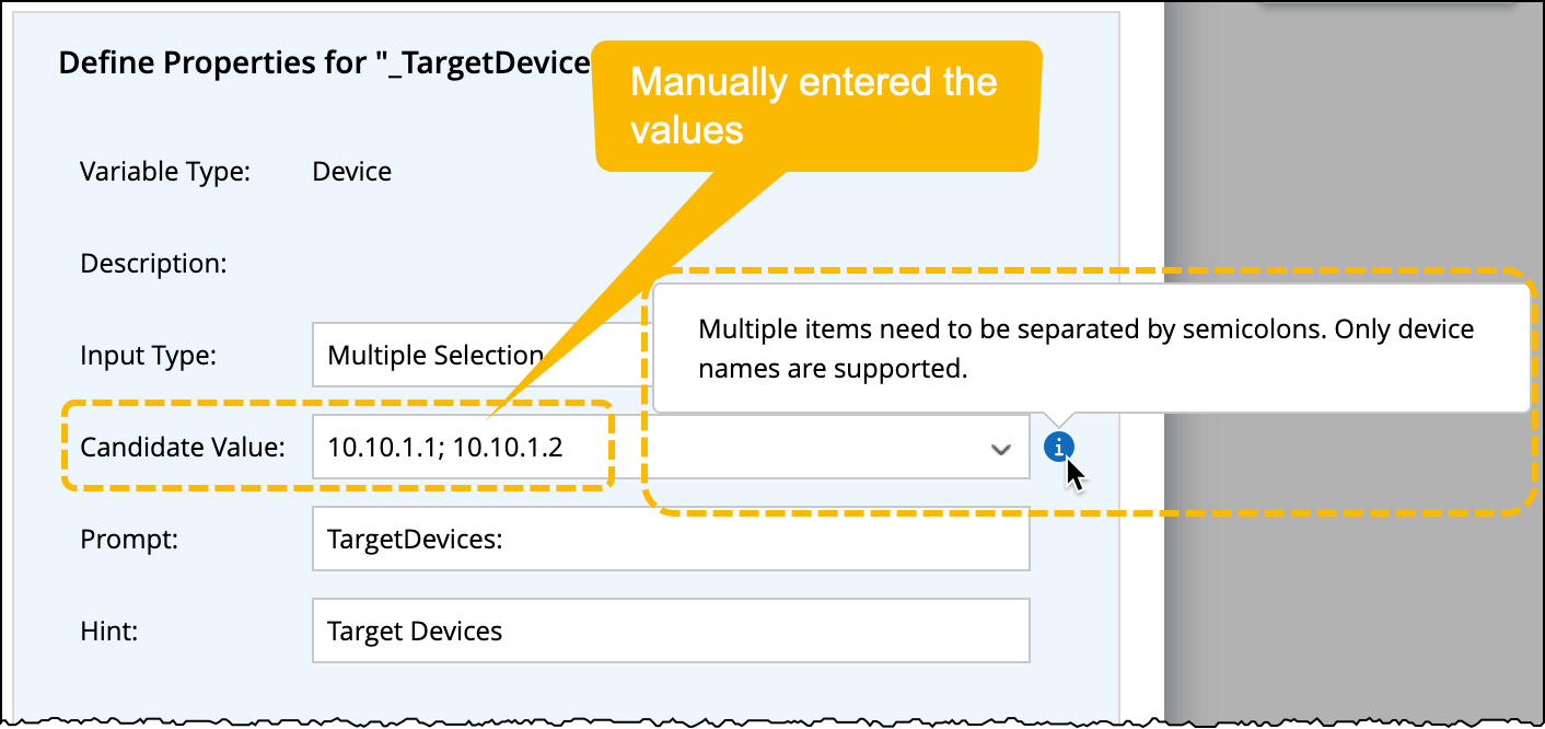 - From Device / Interface Property: This option is applicable only to variable type String. Define a parent variable (e.g., a device) for the current variable and derive candidate values from its properties.