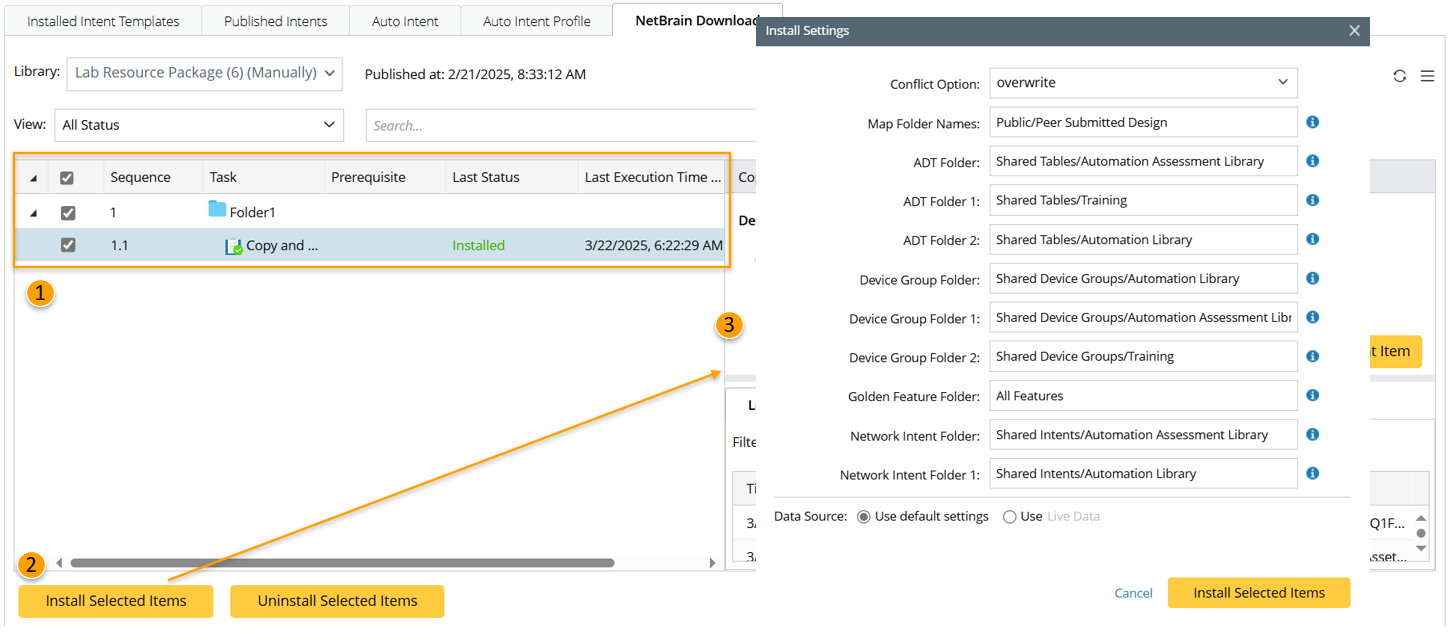 - The Install Settings dialog will appear if any task requires further inputs to complete task installation so that you can refine the task to be installed. Moreover, the data source for these resources can be specified during the installation process (for more information, see Specify Data Source When Installing Resources via NetBrain Download).