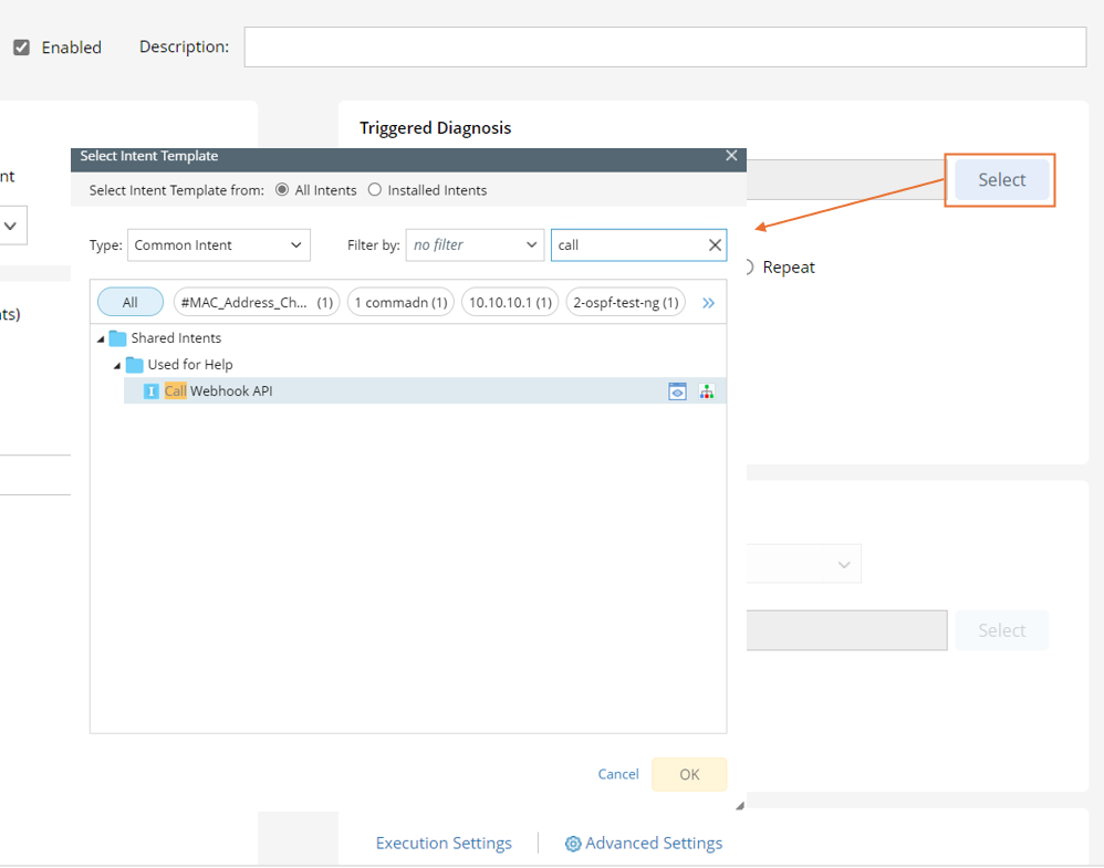 - After the intent template is selected, the Settings for Intent Template-based Triggered Diagnosis dialog will pop out, or you can click Settings for Intent Template, then define the settings in this dialog.