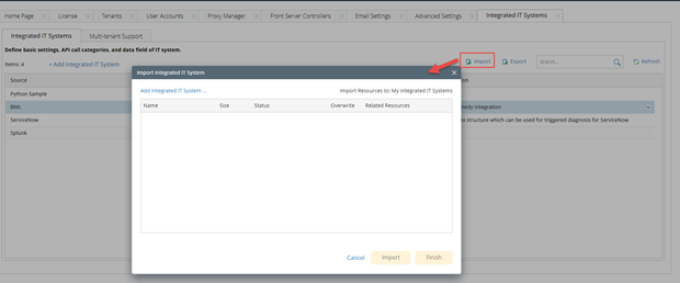 - To import Integrated IT systems from a file, click Import > Add Integrated IT System … > select a local file.