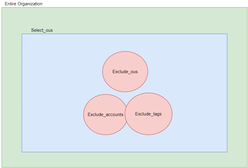 The following diagram gives an overview of how the various conditions work together. The green color represents the entire organization tree. From there, you can define the select_ou to specify certain OUs you want to add to NetBrain. Within the selected OU group, you can use different types of excluding flags to exclude certain ous/accounts/tags. The final accounts added to NetBrain are the area shown in blue.