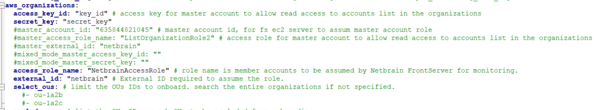 If you use the key-based access to access the master account, list organization information, select the access method as key-based access and configure the access key/secret key to the master accounts, NetBrain will access the master account and list the organization information.