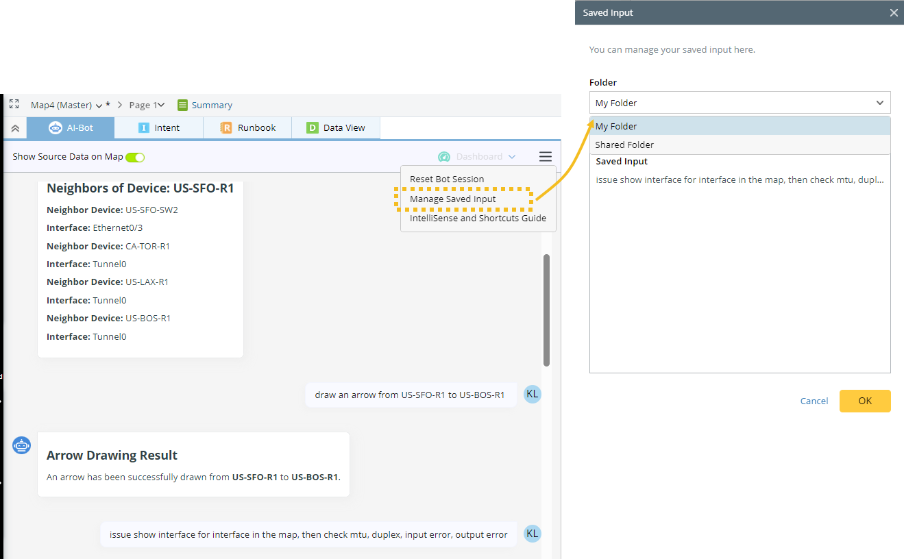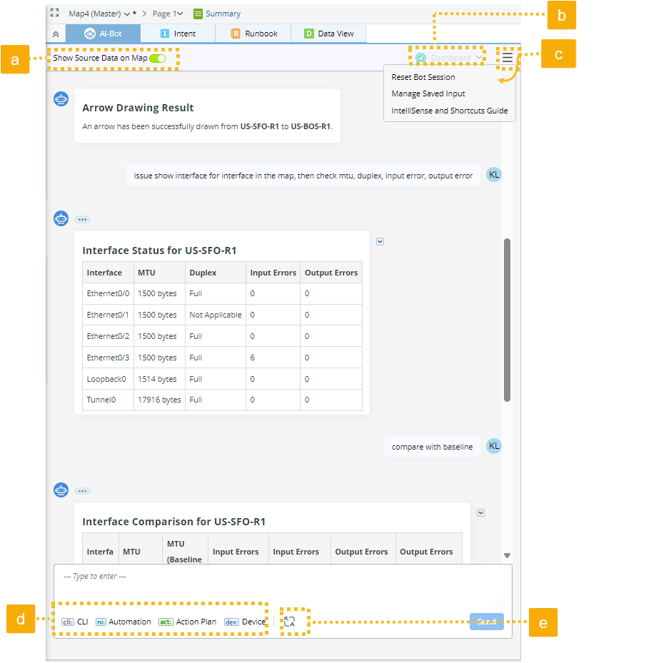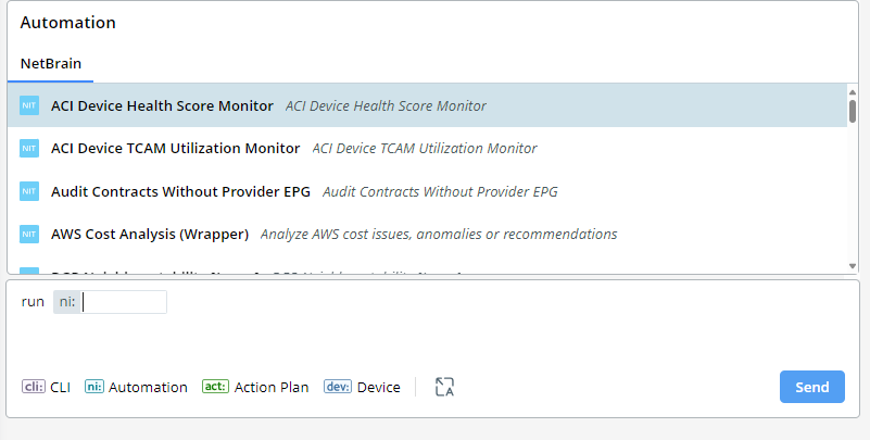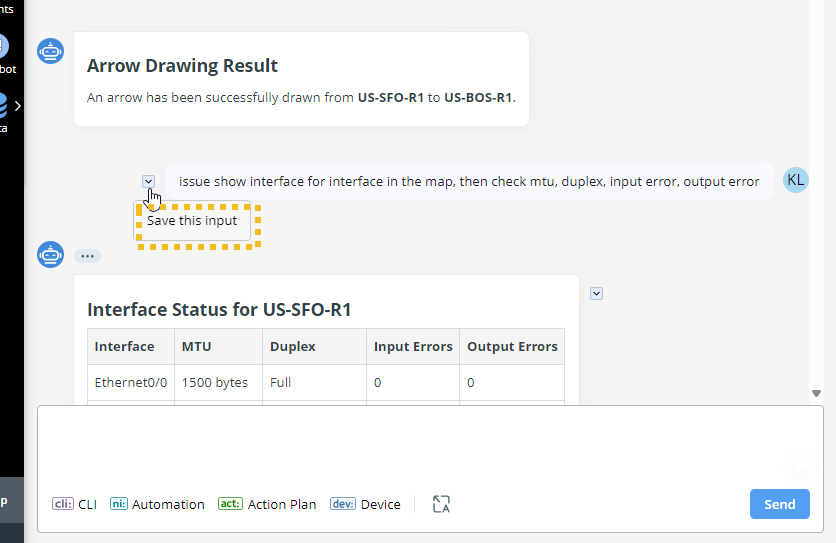 Specify the input type for the AI bot to reason and respond more precisely. If the user knows what they want to do and/or what automation they want to execute and wants to receive a more precise response from the bot, they can tag their input by specifying the type (CLI, Automation, Action Plan, or Device).