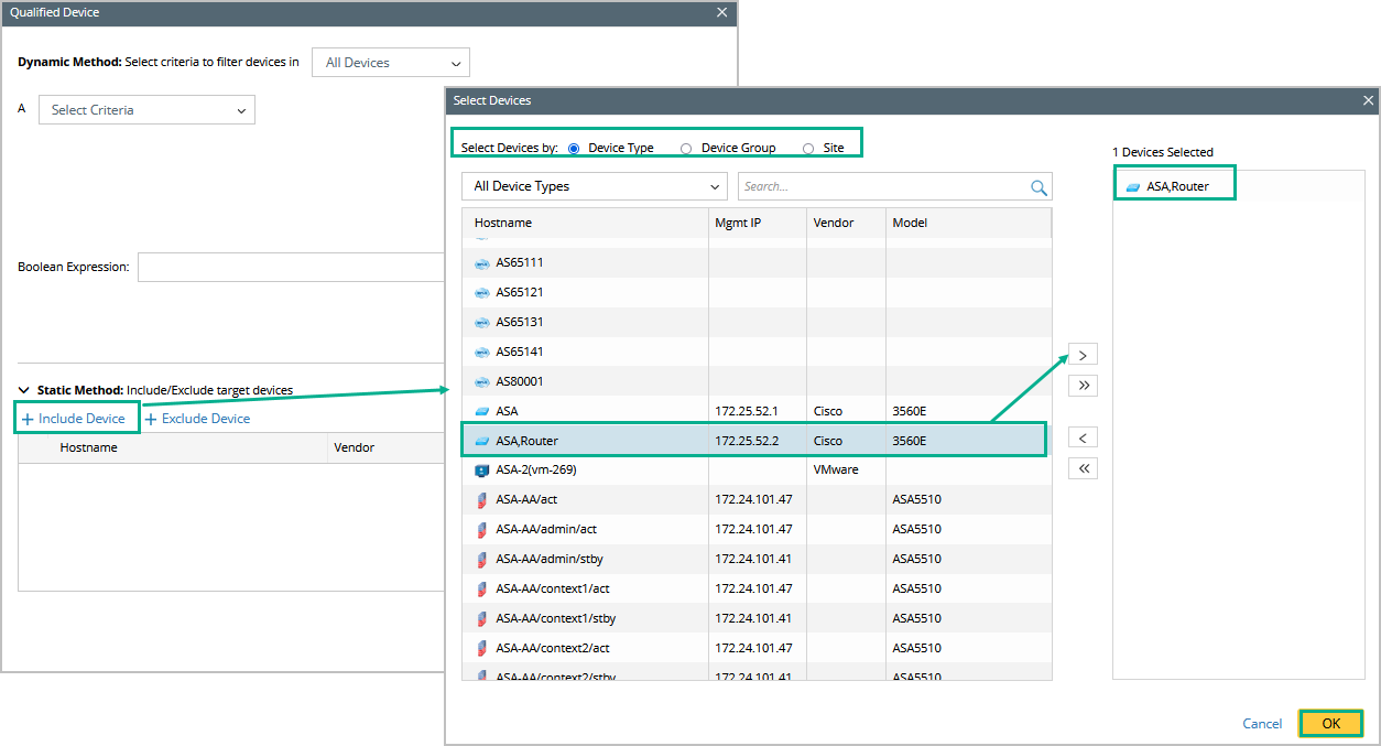 - Under the static method, you can include and exclude the devices. When you click + Include Devices, you can see the Select Device window.