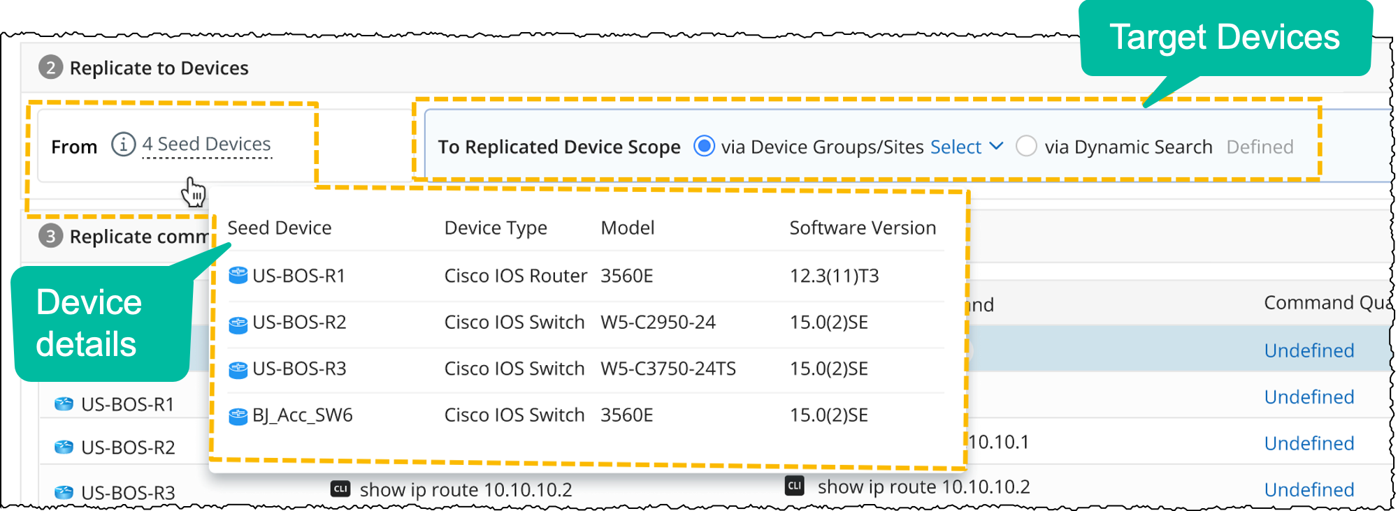 - Go to the Command Qualification column and click the Undefined hyperlink of a seed command to define target devices.