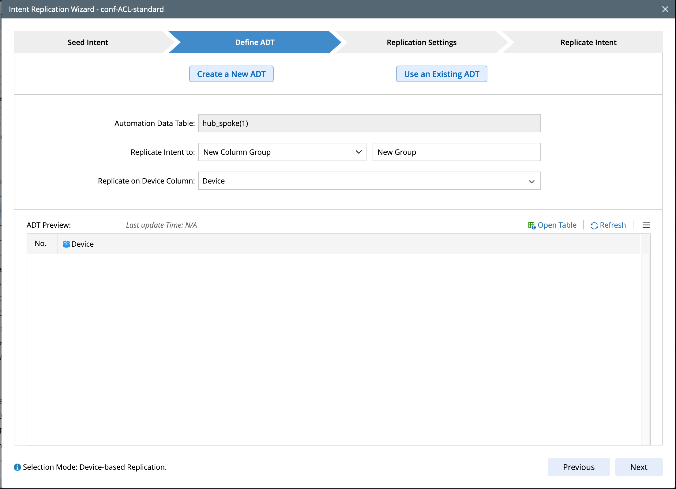 - Replication Settings: Define the qualified device scope for the seed intent template to replicate intent and configure the macro variable values for replicating ADT intents. Also, other advanced replication settings can be made here.