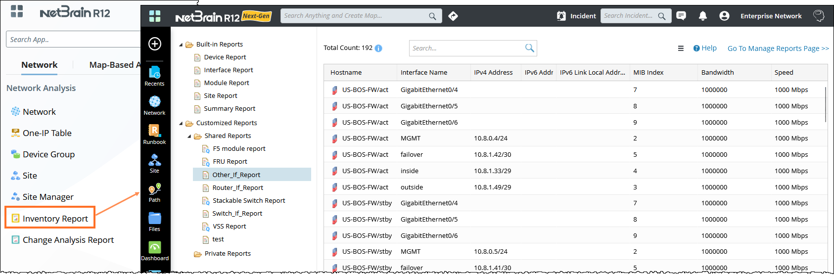 The Inventory Report records comprehensive inventory data of your network, including device data, module data, interface data, site data and more. You can either use Built-in Reports as templates to export or customize your reports by specifying device scope and asset data.