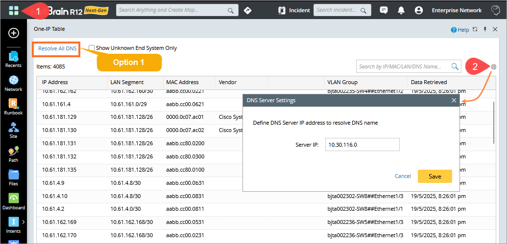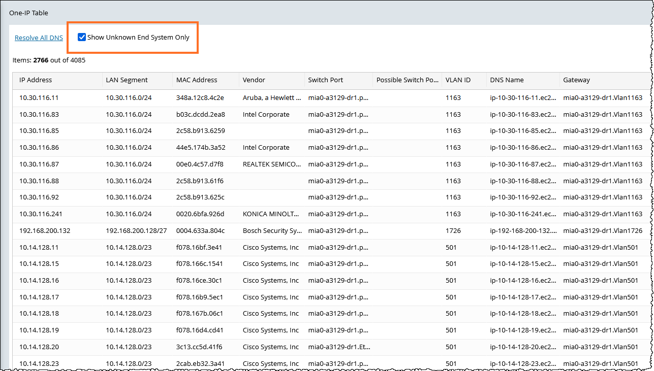 - (Option 1) Click Resolve All DNS on the One-IP Table page. Resolve the DNS names for all unknown end systems. Depending on the number of unknown end systems, this operation can take a long time.