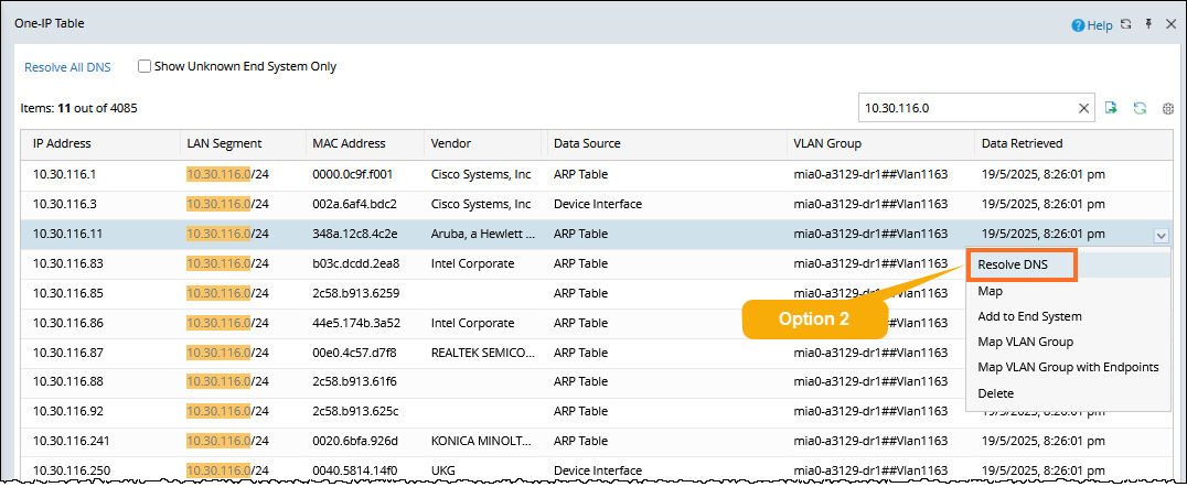 on a selected entry and select Resolve DNS. Resolve the DNS name for a specified unknown end system from the One-IP table.