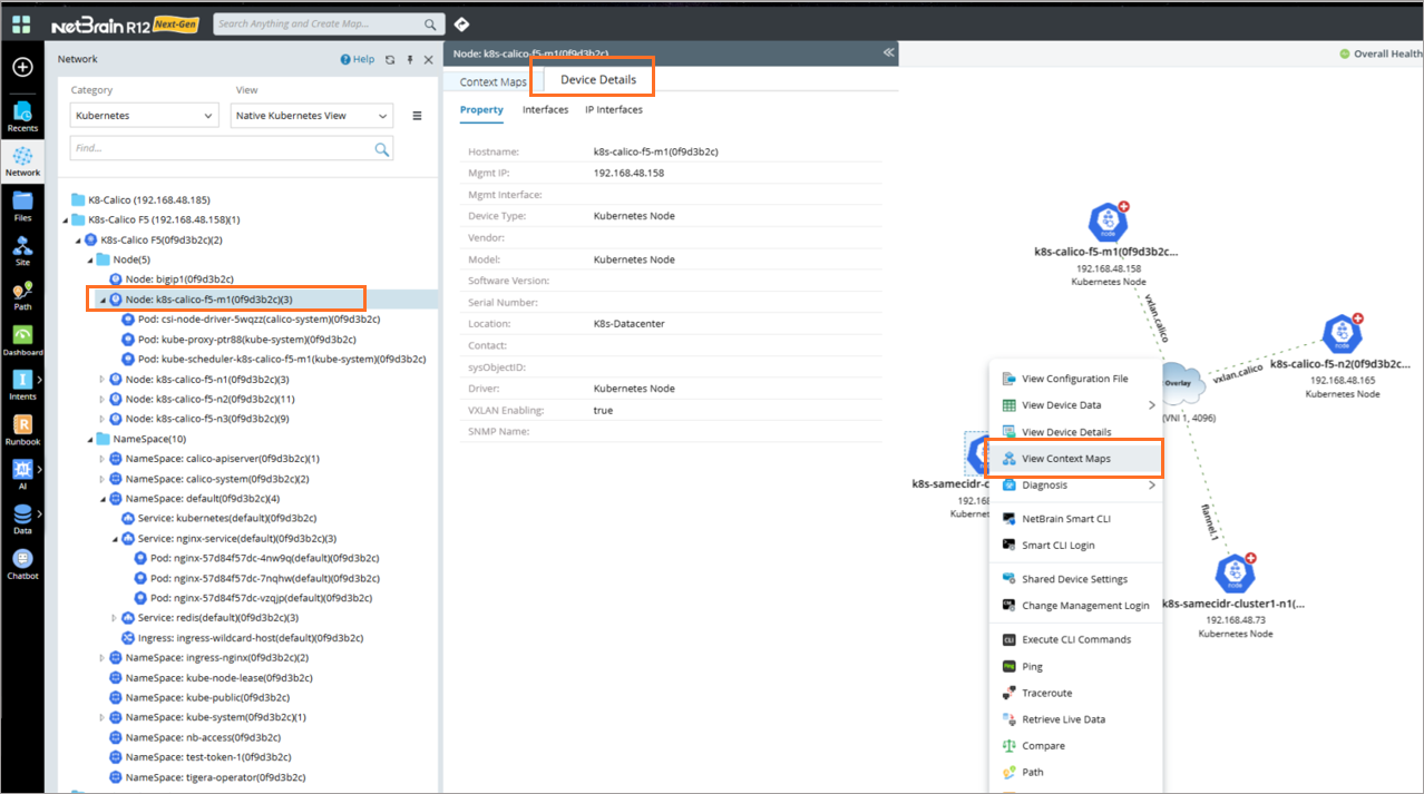 Right-click the node on the map and select View the Context Map. This will display the Context Map, which provides information about Kubernetes Internal/External connectivity. It shows the Dynamic Map based on various scenarios like L3 Topology, L2 Overlay Topology, and L2 Topology.