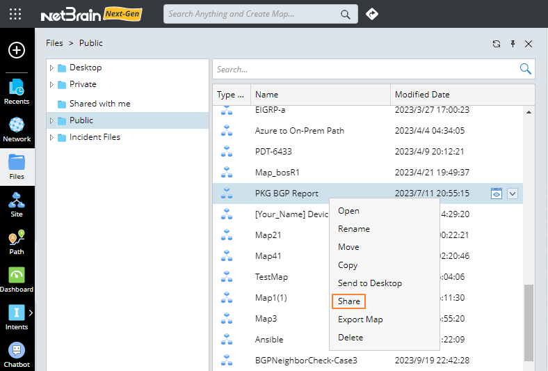 - Locate the target map or dashboard file, right-click it and then select Share from the drop-down menu.