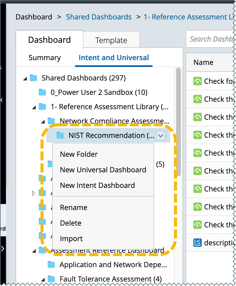 New Intent Dashboard : Use this option to create a new Intent dashboard under the selected folder.