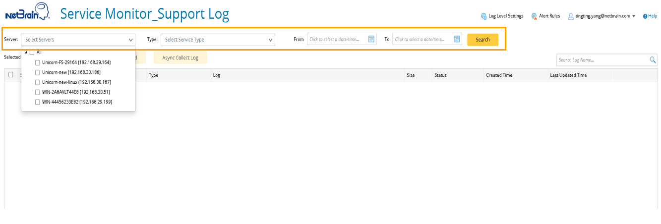 - Filter out desired logs by the server, service type and the period during which logs are generated.