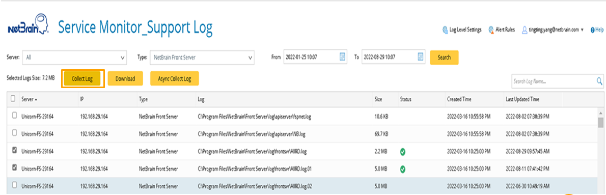 - Click Async Collect Log, then enter an email address in the pop-up window.