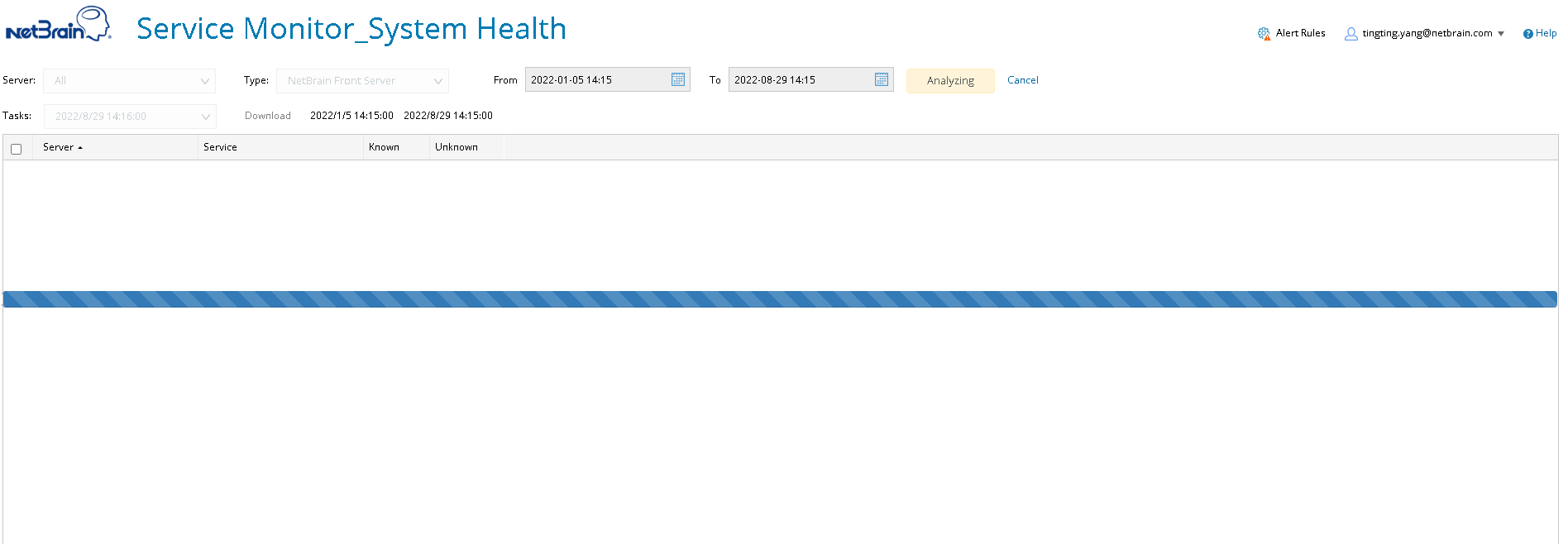 - Filter the logs to be analyzed by selecting the server, service type, and period, then click Analyzing.