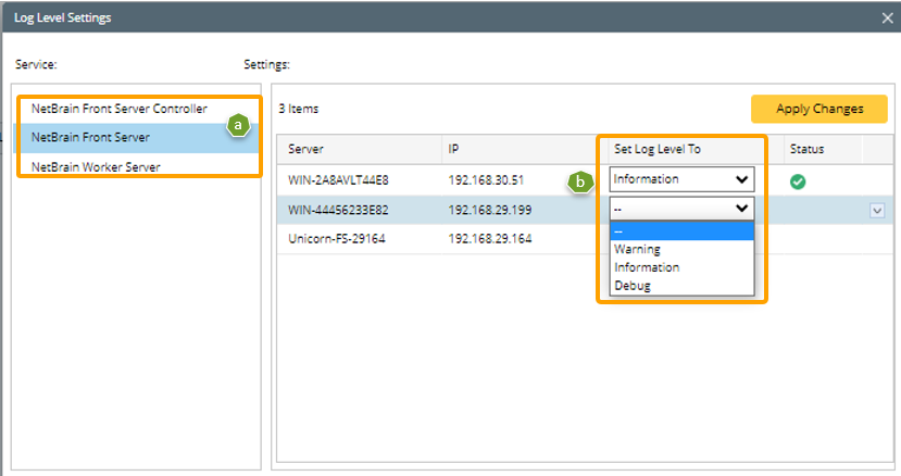 - Click Log Level Settings, then set the log levels for the three type of services.