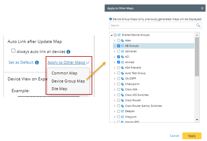 Note: For some map page settings, you can apply the setting to other maps. Click Apply to Other Maps, then click one of the three map categories (Common Map, Device Group Map, Site Map) to select the maps to apply the setting. ![]() |