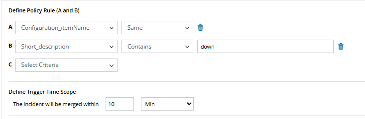 You may have various ticket types in the system that need to be handled differently. For example, BGP-related tickets may be merged once a day, while interface-related tickets may be merged every hour. You can use policies to manage different scenarios effectively by defining how and when the incidents should be merged.