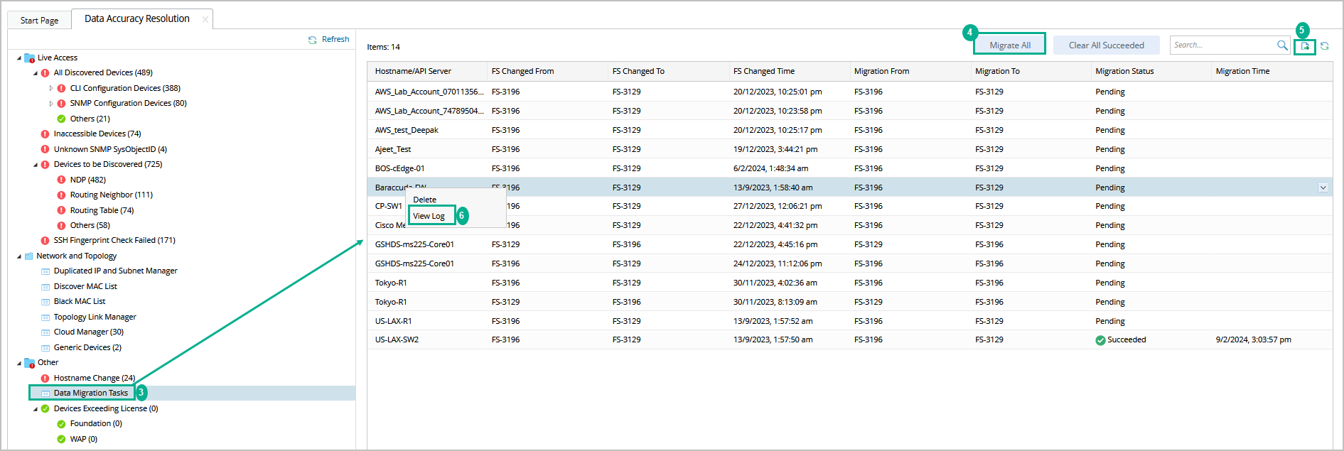 - Select Data Migration Tasks from the Data Accuracy Resolution page. You can view all the Front Server changes listed in this page.