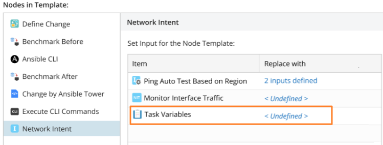 The items displayed in the Network Intent area are automatically retrieved from the Change Management Runbook Template. These items allow you to assign values using NI variable values to: